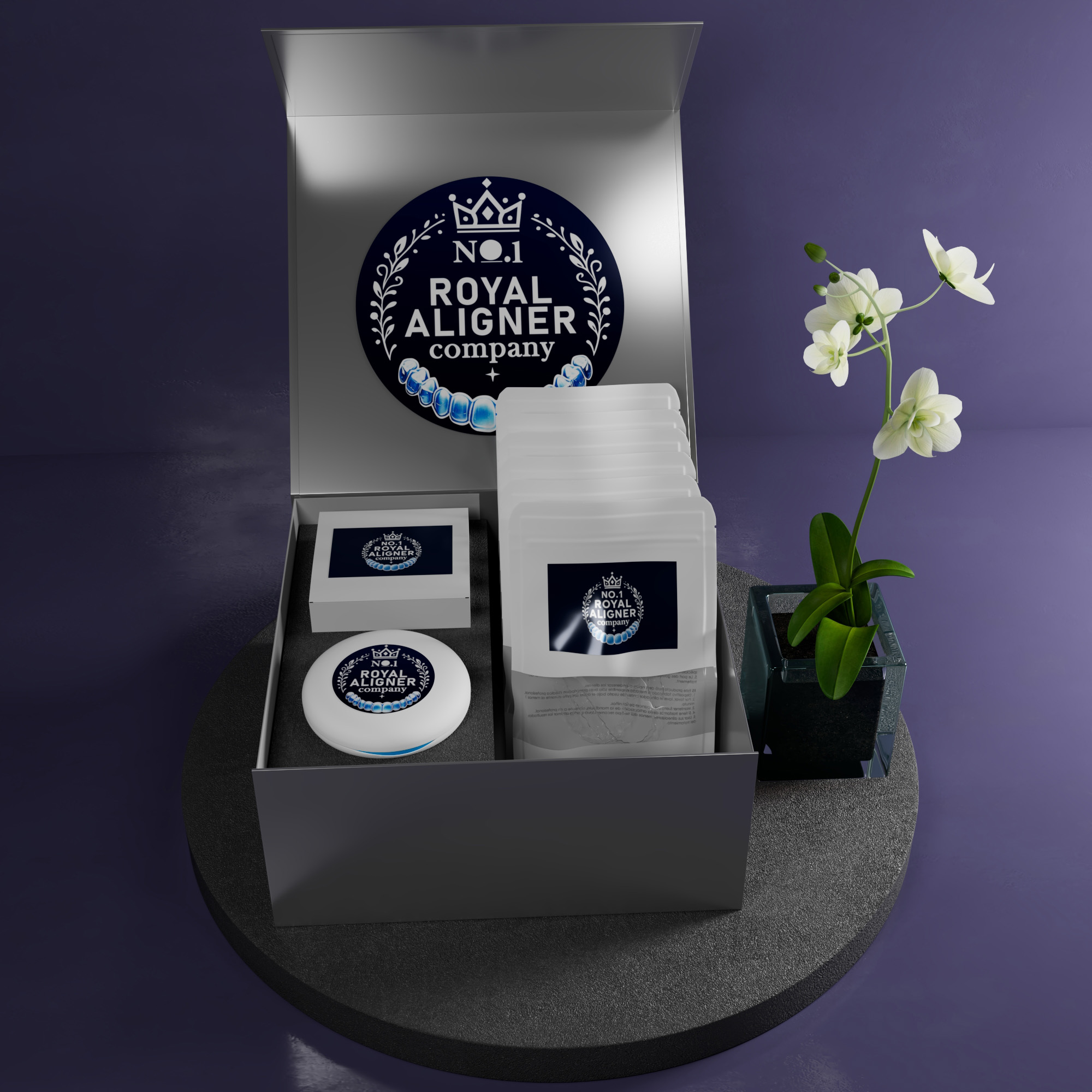 Estimated treatment duration is 4 to 8 weeks, depending on the case. Aligners should be worn 20–22 hours daily, only removed for eating, drinking (except water), and oral hygiene.